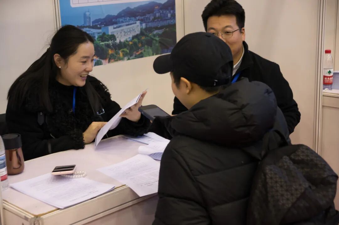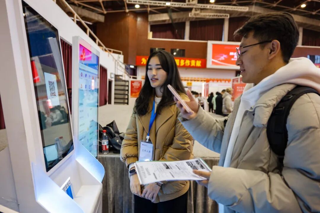 双选会采取“招聘+指导”双轮驱动模式。现场专门设置教师简历面试指导、参军入伍、机关事业单位招考、教师资格考试、北京教师招聘、全国大学生职业规划大赛、出国留学等咨询展台,为学子们提供了指导服务。联合中国教育在线引入AI简历制作打印系统、线上模拟面试平台、职业规划测评系统三大智能服务,构建“线上+线下”融合的就业指导生态,实现从岗位匹配到能力提升的全流程赋能。
